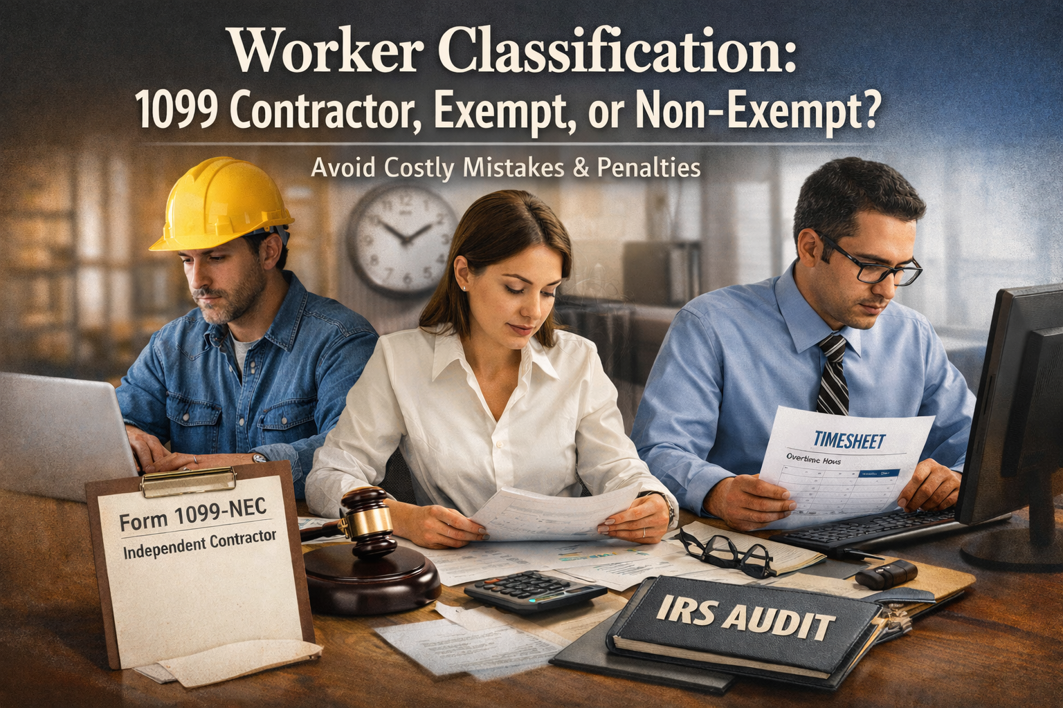 A clear breakdown of 1099 contractors, non-exempt employees, and exempt employees, explaining pay structure, duties, and compliance requirements to help small business owners classify workers correctly and avoid legal risk.