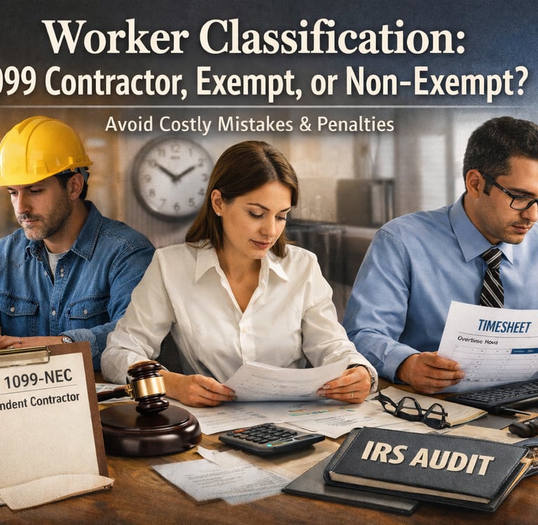 Correctly classifying workers is one of the most important HR responsibilities for a small business owner. The difference between a 1099 contractor, an exempt employee, and a non-exempt employee determines how you pay taxes, handle overtime, and stay compliant with labor laws.